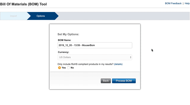 Una vez que finaliza sus opciones, la herramienta BOM de Mouser comenzará a buscar coincidencias en los artículos de su BOM. El tiempo de procesamiento puede ser desde unos instantes hasta algunos minutos según el tamaño de su BOM.